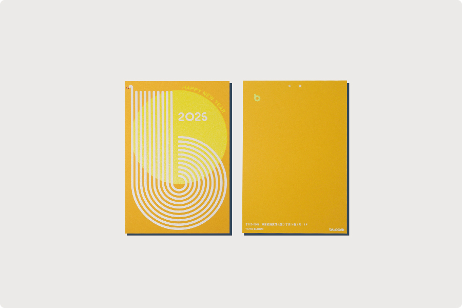 TAIYO BLOOMの年賀状デザイン2025。BLOOMのロゴに巳年のへびを重ね、縁起の良い明るい一年になるようにデザインいたしました。